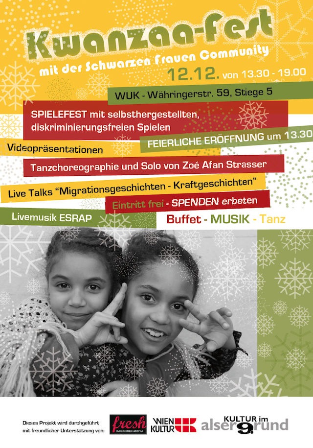 Am 12. Dezember von 13 bis 19h findet in den Räumlichkeiten des WUK in der Währingerstrasse 59 das Kwanzaa Fest statt. Veranstaltet wurde dieses Fest wie jedes Jahr von der Schwarzen Frauen Community.
